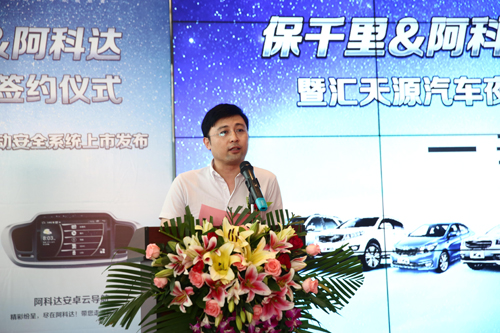 随后,汇天源汽车集团董事长助理蒙文斌、阿科达汽车电子有限公司总经理温寒分别发表致辞。他们一致表示,随着汽车后市场之争日趋火热,只有洞悉消费需求,运用创新思维,坚持服务至上,企业才能获得健康、持久发展。他们相信,依托保千里在汽车主动安全领域的卓越实力与汇天源集团坚实的渠道、客户基础,通过高效整合双方在技术、产品、销售、服务等多方位资源,将联手打造安全行车新风尚。